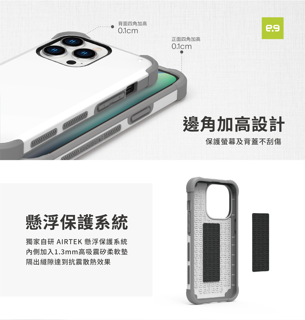 內部導入獨家自研 AIRTEK 懸浮保護系統設計,保護殼內側加入 1.3mm 高吸震矽柔軟墊,透過懸浮軟墊隔出縫隙,達到抗震及散熱降溫。