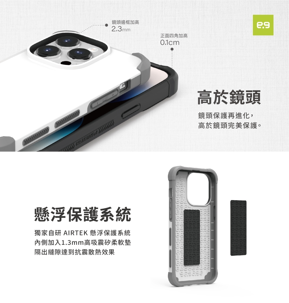 內部導入獨家自研 AIRTEK 懸浮保護系統設計,保護殼內側加入 1.3mm 高吸震矽柔軟墊,透過懸浮軟墊隔出縫隙,達到抗震及散熱降溫。