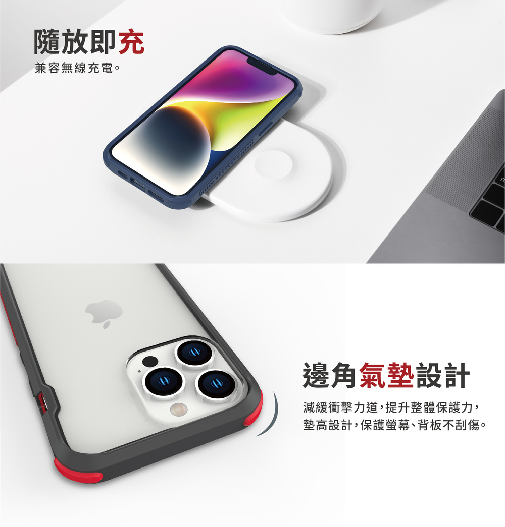 四角氣墊使用3M特殊抗震材質,減緩衝擊力道並強化邊角保護,邊框四角加高,整體螢幕及背板保護提升,平放桌面不會蹺蹺板。